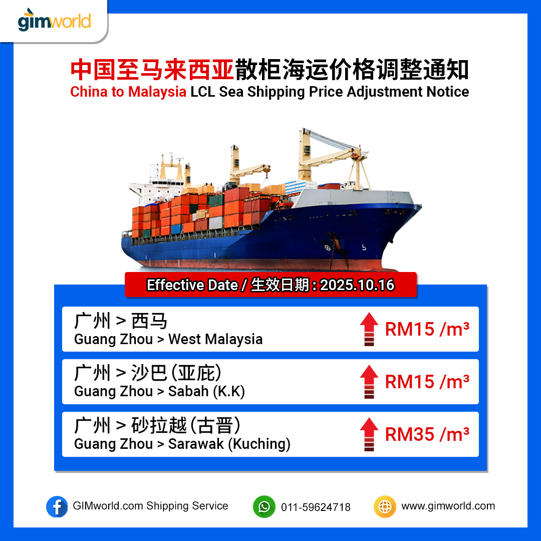 | 16/10/2025 China to Malaysia LCL Sea Shipping Price Adjustment Notice