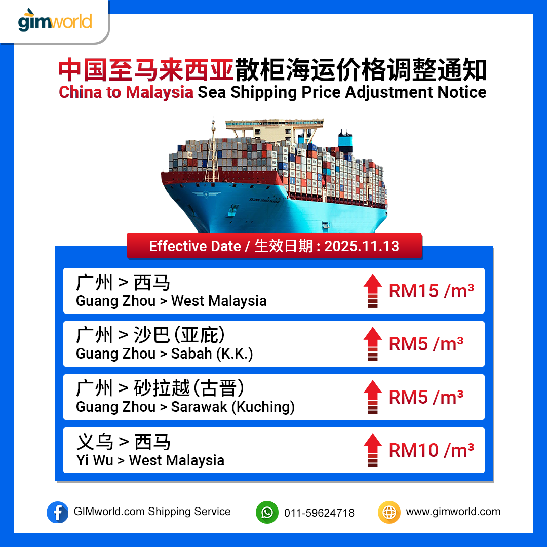 | 13/11/2025 China to Malaysia LCL Sea Shipping Price Adjustment Notice