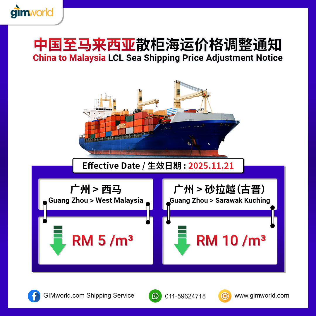 | 21/11/2025 China to Malaysia LCL Sea Shipping Price Adjustment Notice